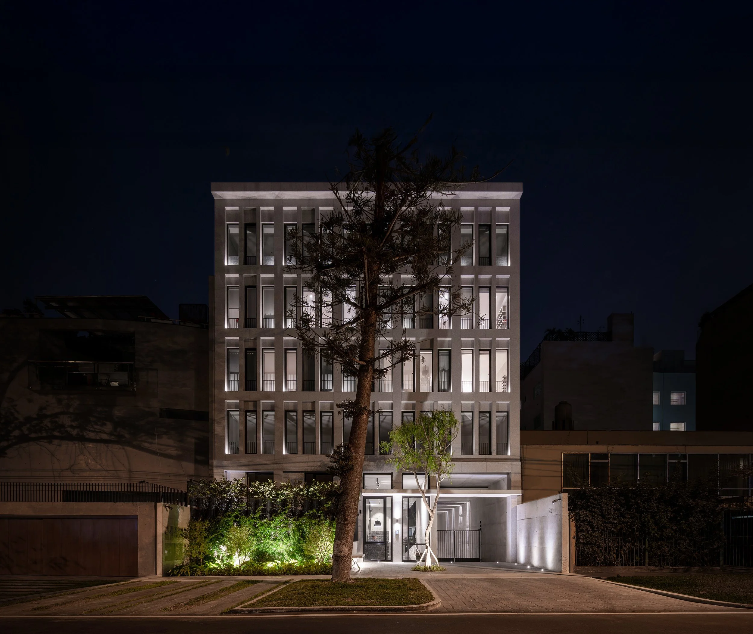 La arquitectura se abre hacia el Boulevard Roosevelt a través de una retícula de losas y columnas que enmarcan las visuales hacia la vegetación, generando una experiencia visual verde, serena y contemplativa. El edificio está revestido en terrazo y el piso de ingreso en piedra talamoye, piedra que refuerza la continuidad entre ambos frentes generando un recorrido que es a la vez urbano, privado y paisajístico.